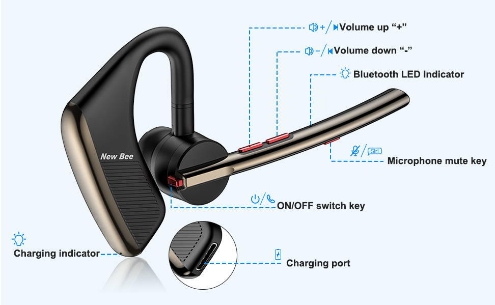 “Bluetooth Headset New bee V5.2 Wireless Bluetooth Earpiece 24Hrs Talktime CVC8.0 Dual Mic Noise Cancelling”