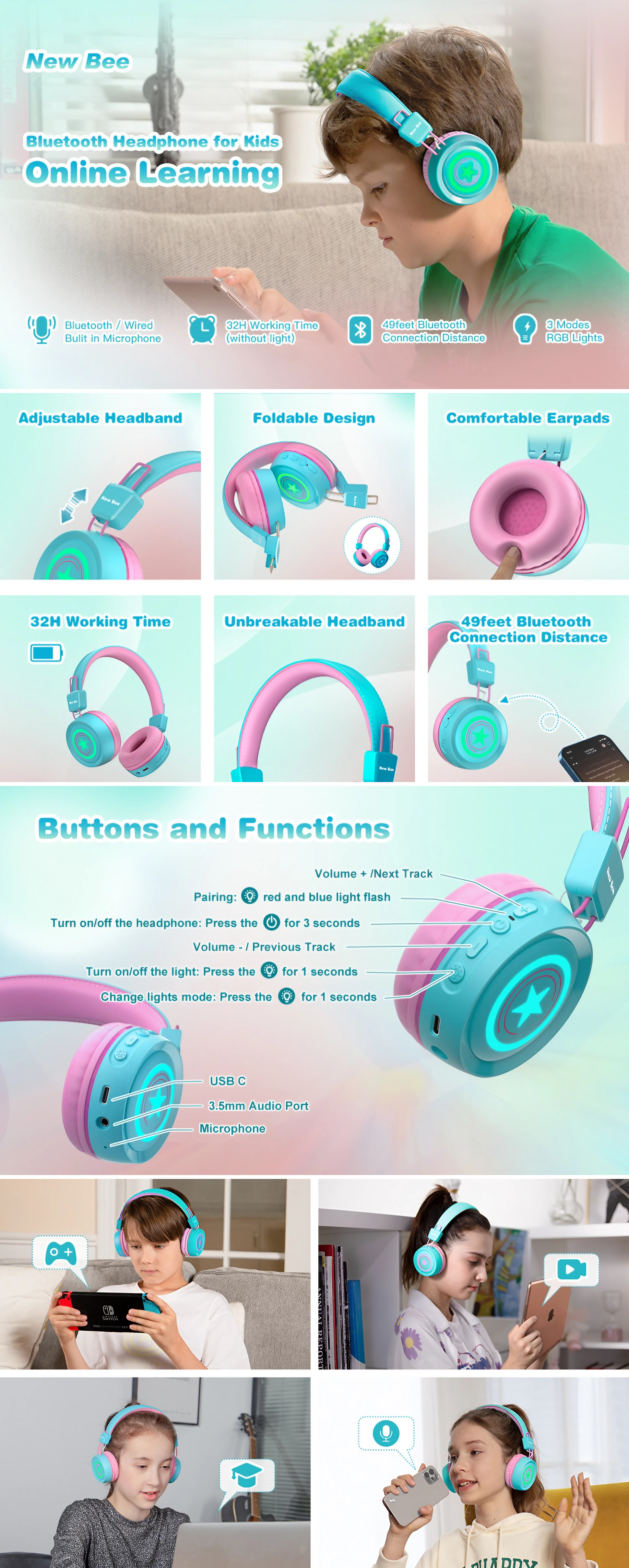 New Bee KH22B Kids Wireless Headphones