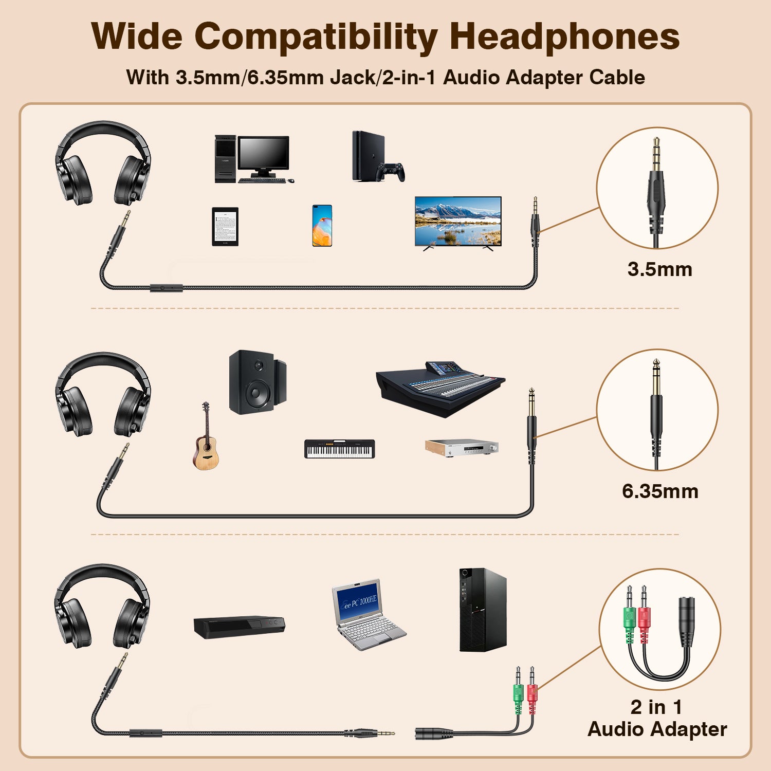 Transition seamlessly between any audio environment. Equipped with a standard 3.5mm plug, a gold-plated 6.35mm (1/4") adapter, and a Y-splitter, these headphones offer plug-and-play versatility for studio consoles, mixers, digital instruments, and mobile devices.