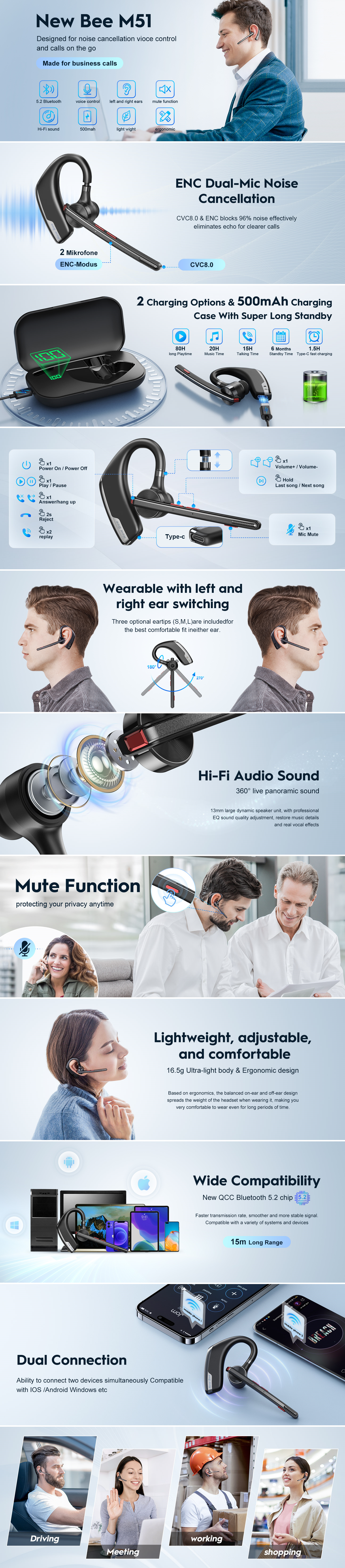Engineered for the long haul, the M51 features a 500mAh charging case that extends your total talk time to a staggering 80 hours. Even without the case, the standalone headset delivers a robust 15-20 hours of continuous use. With dual charging options and fast-recovery power, you are always ready for your next business trip or marathon shift.